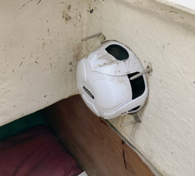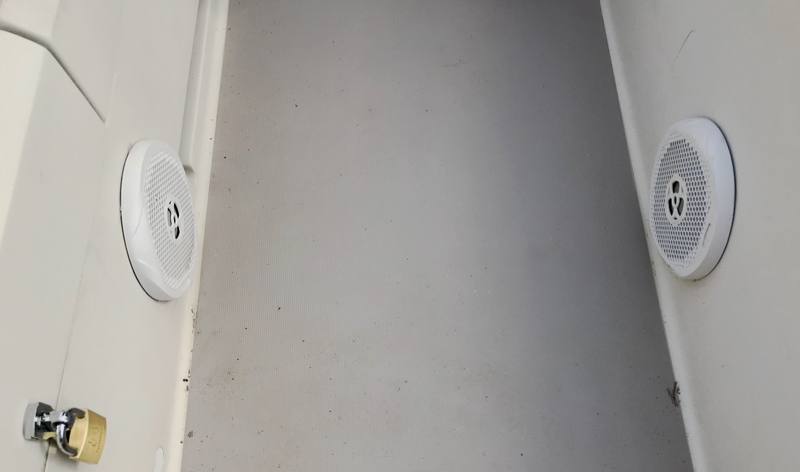 For example, we have a quarter berth which is below the seat on the port side (left) in the cockpit. The berth is a cozy place were someone can sleep and is tucked under the long seat overhead in the cockpit. A flaw the space had was a speaker that had been mounted on the wall. There was a matching speaker on the starboard side as well.