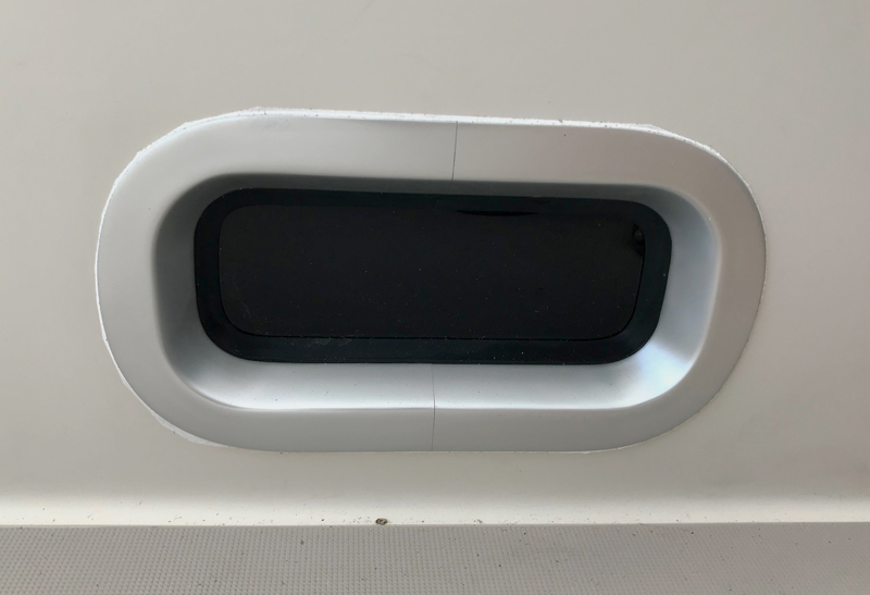 My husband re-cut the hole, shaping it into a long oval and installed an aluminum port which could be opened from the inside and have a screen inserted. It is a very smooth surface on the outside.