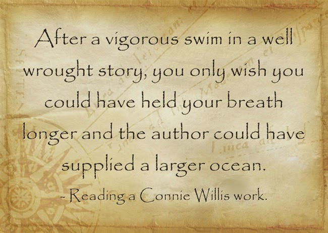 Reading a Connie Willis novel is like drowning. Her very first paragraph is a rip tide that lets you get a breath just often enough not to drown you. You spend a lot of time treading water, but the liquid feels so lovely against your skin, a blood warm suspension, and you pray for breath and continued immersion in the same bubble rising to the surface. No ground beneath your feet, but somewhere along the line you learn to stay above water, gain a sense of where land is and strike out in an Australian crawl that you didn’t know you could do. At about the time the book ends, your toes feel the roughness of sand and sea shells and you wade to shore. Welcome to Willis style writing. What will you do, probably what I did. Go dive into another Connie Willis book.