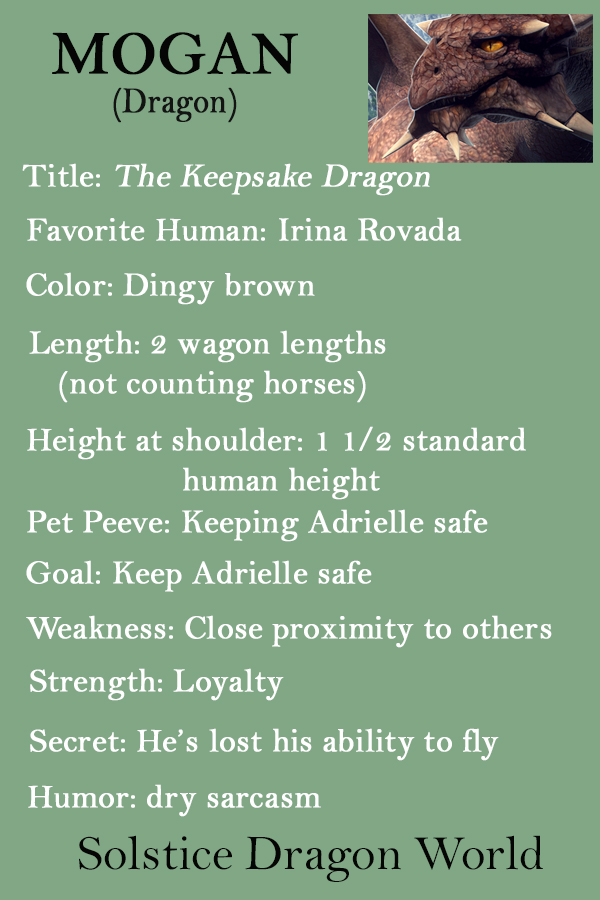 Adrielle Rovada: last of the Rovada clan inherits Mogan, a bored dragon with issues concerning interacting with anyone. Oddly, he won't let her go anywhere alone, even when it requires following her to the city.